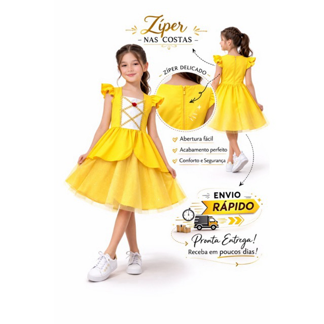 Nossas fantasias são confeccionadas com **tecido leve e confortável**, que não amassa e permite total liberdade de movimento, além de oferecerem um **ótimo caimento e cores vibrantes**. Com **não pinica** e **pronta entrega**, você não precisa esperar para ver sua filha se transformar na princesa que sempre sonhou! **Benefícios:**