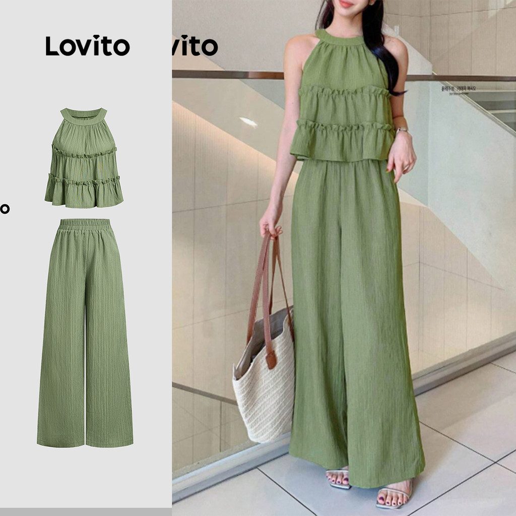 Lovito Conjuntos de calças elegantes com babados, hortênsia e calças verdes leves para mulher LB135LD425